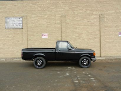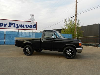 Body: Tuxedo black paint by Kustom Auto Body in Coaldale, AB, Stull square tube grill, Lund steel rollpan, Line-X bedliner, Altezza tail lights, 1996 F150 side mirrors, Headlamps w/o trim, De-emblemed.